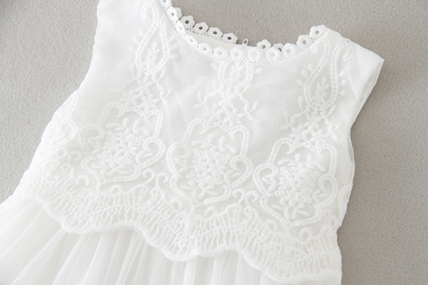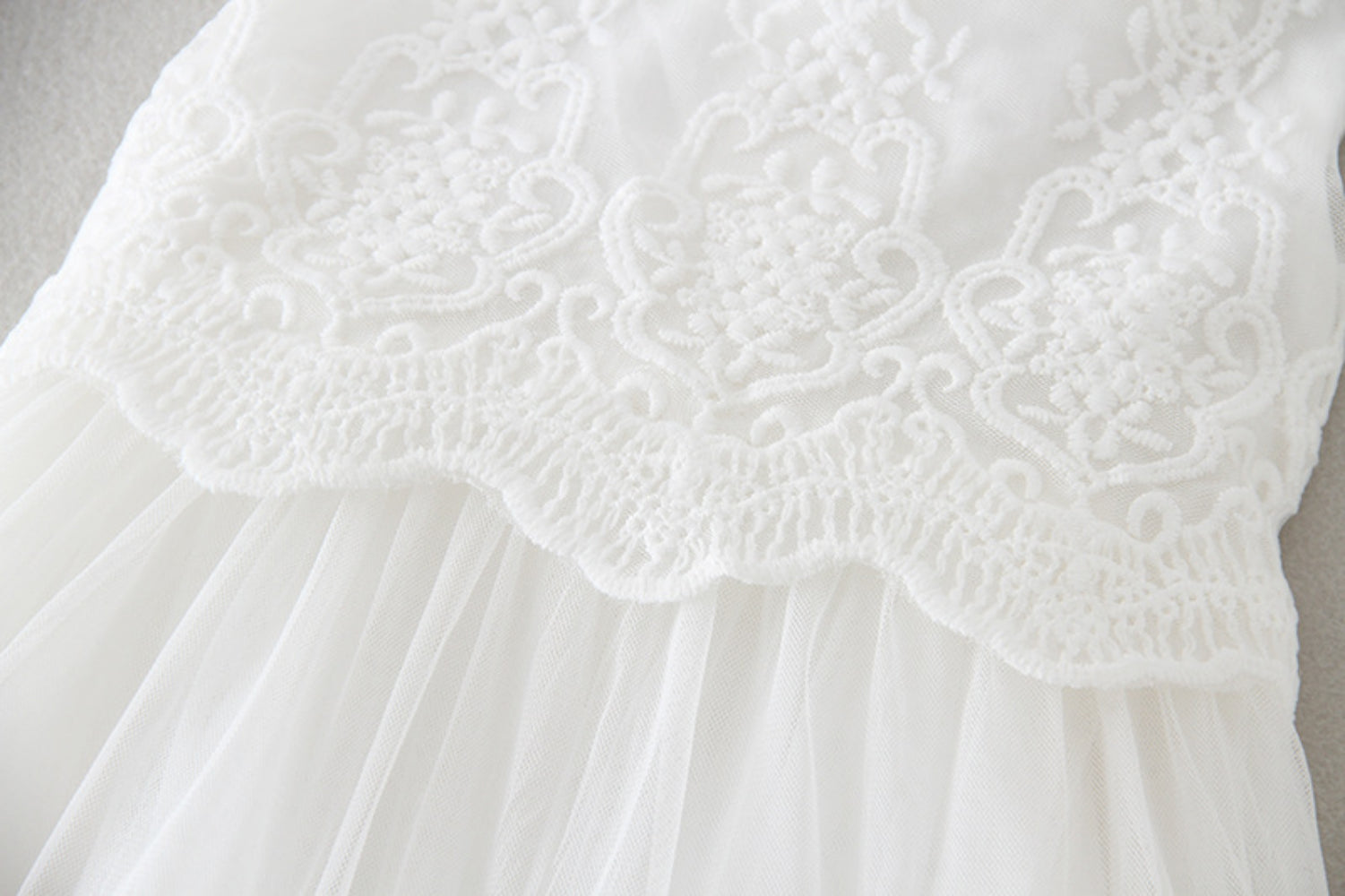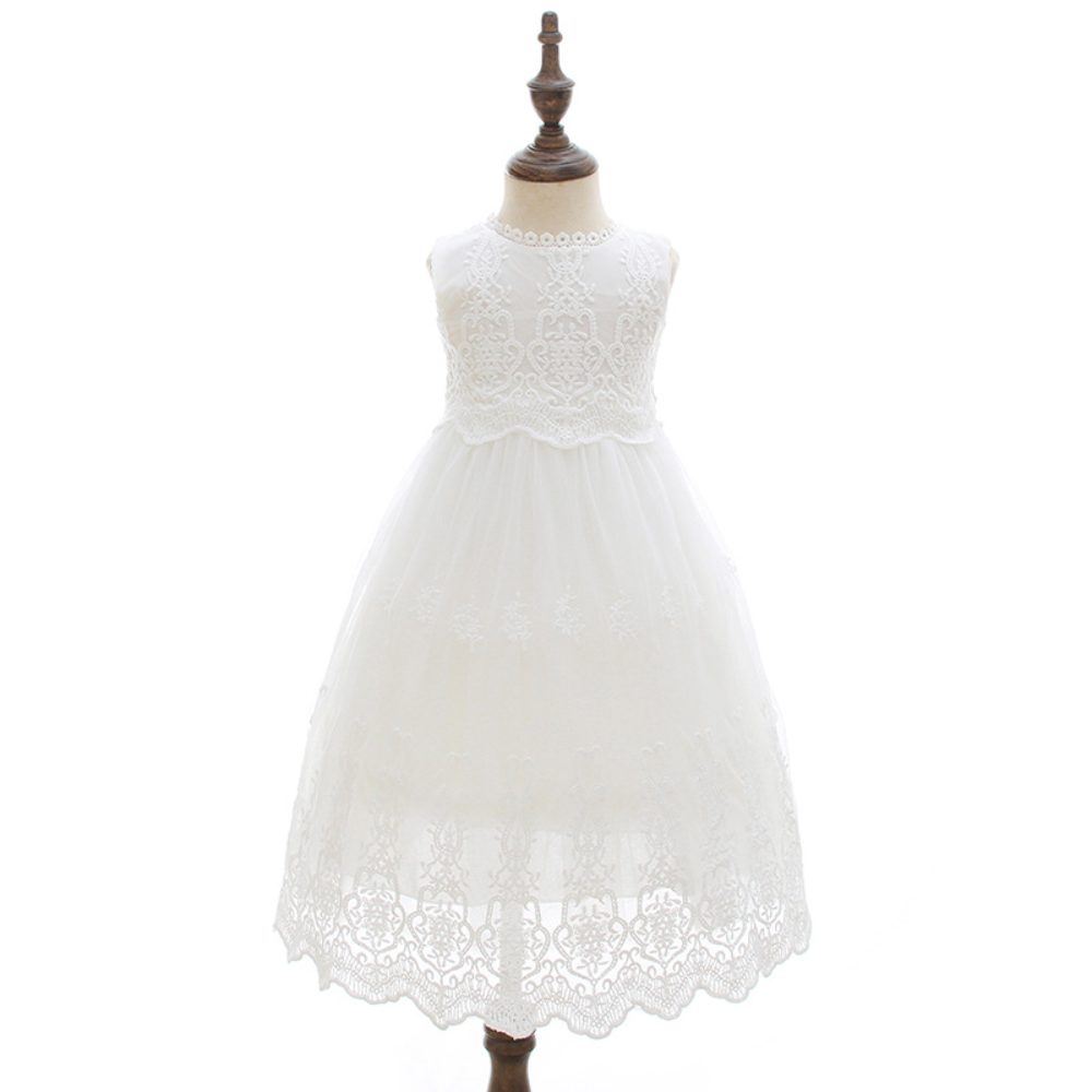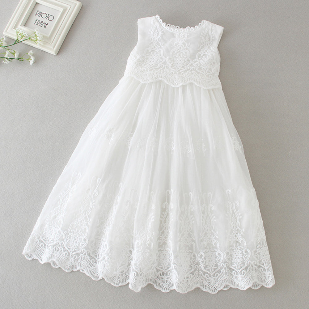 This elegant christening gown is designed with timeless grace in mind. Featuring soft lace detailing, a sleeveless cut, and a flowing silhouette, it offers both beauty and comfort for your baby girl’s special day.