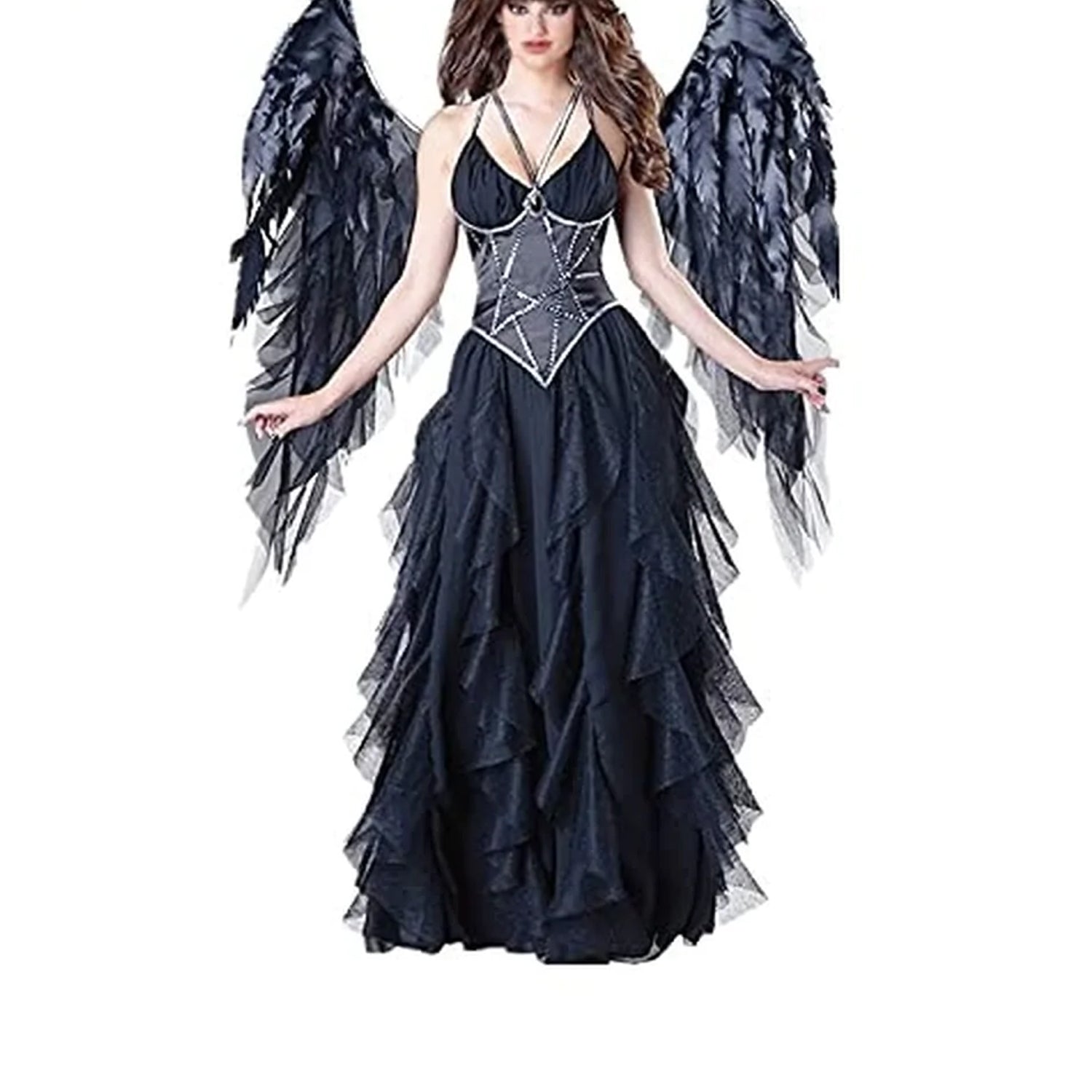 Dark Angel Costume Adult Fallen Angel Women Halloween Fancy Dress with Wings and Halo