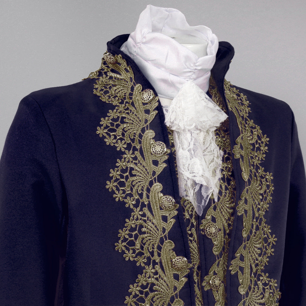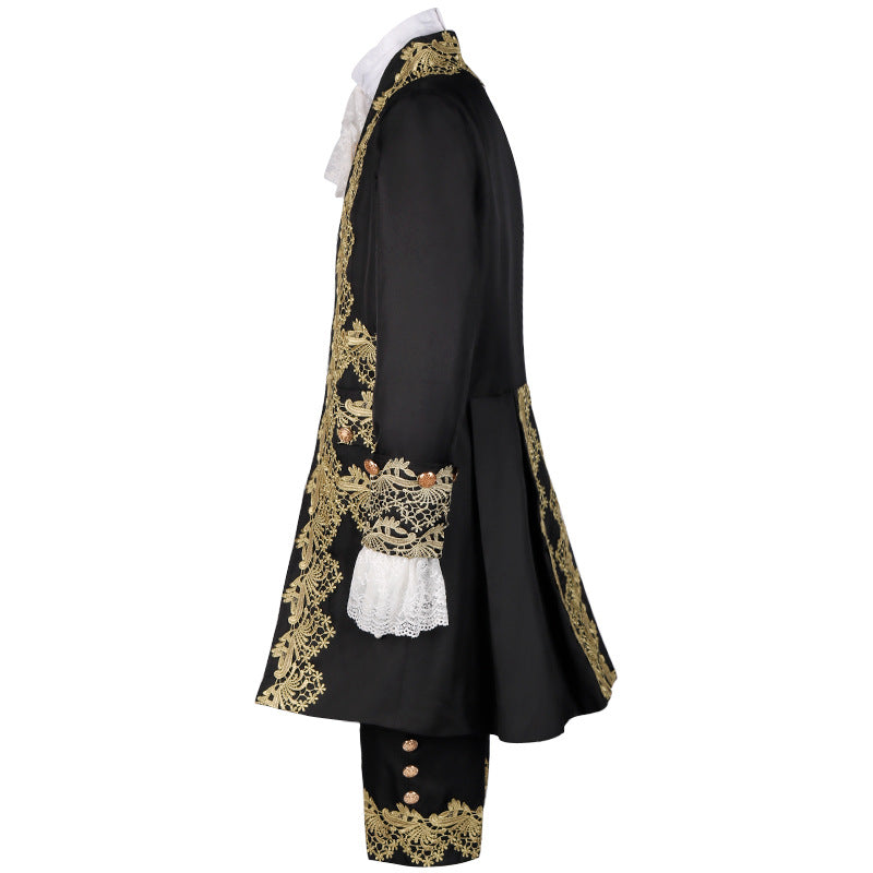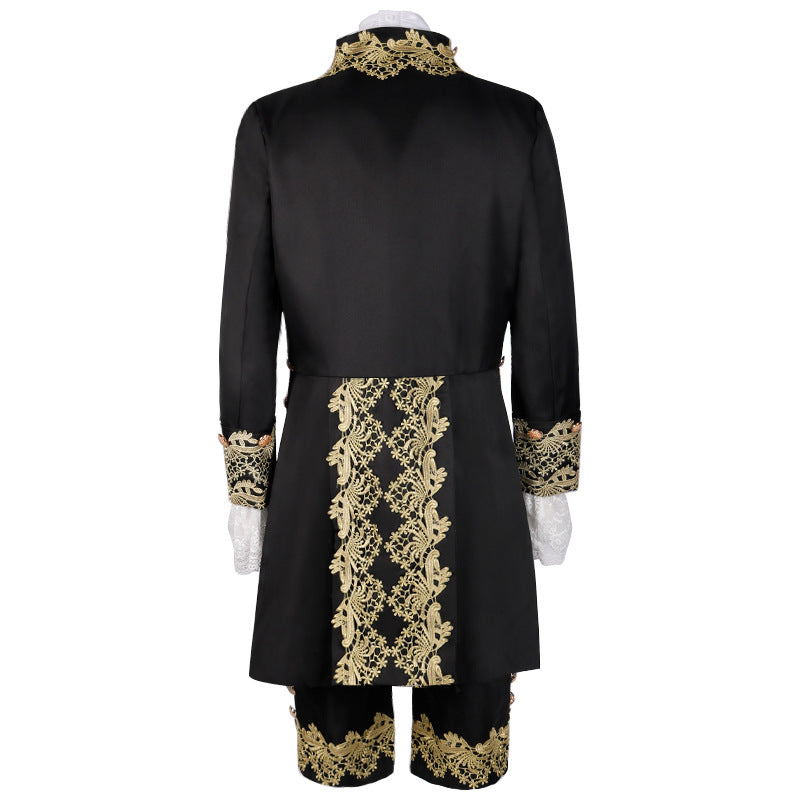 Bring elegance and nobility to your next event with this embroidered Prince Court costume. The retro black coat and coordinated pieces feature luxurious gold embroidery, perfect for stage performances, cosplay, Renaissance fairs, masquerade parties, and historical reenactments.