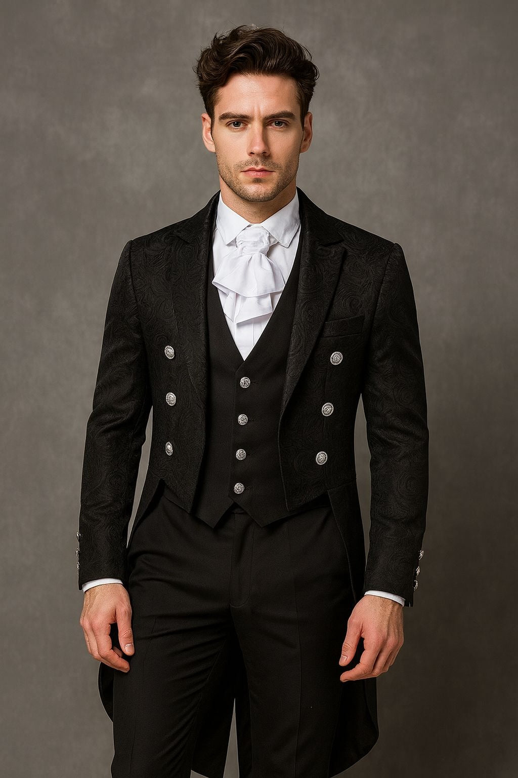- Tailcoat silhouette with vintage-inspired buttons