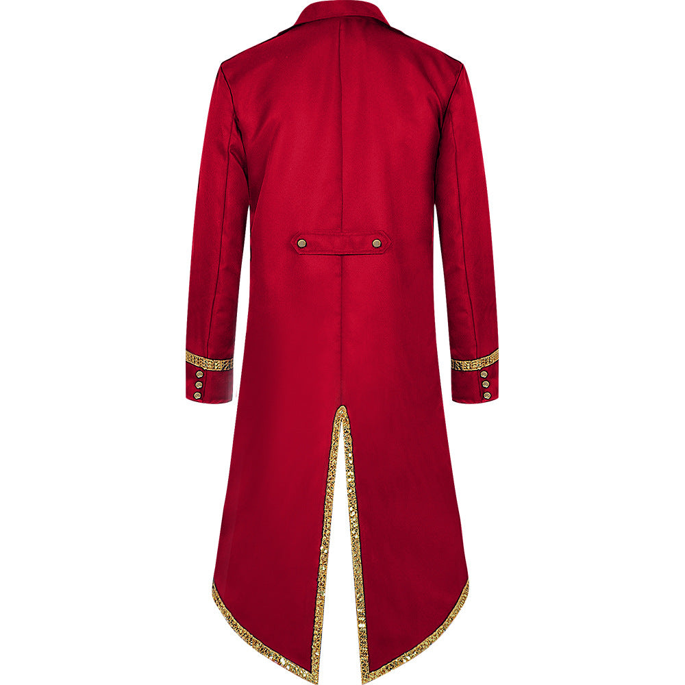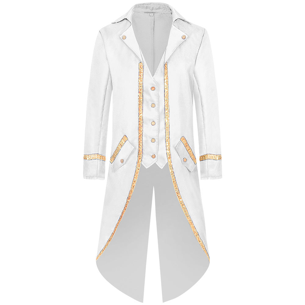 Elevate your wardrobe with this men’s vintage steampunk tailcoat—a bold blend of Gothic elegance and Victorian flair. Designed with shiny gold-edge trim, the retro tuxedo silhouette is ready for cosplay, themed parties, stage performances, and formal steampunk events.