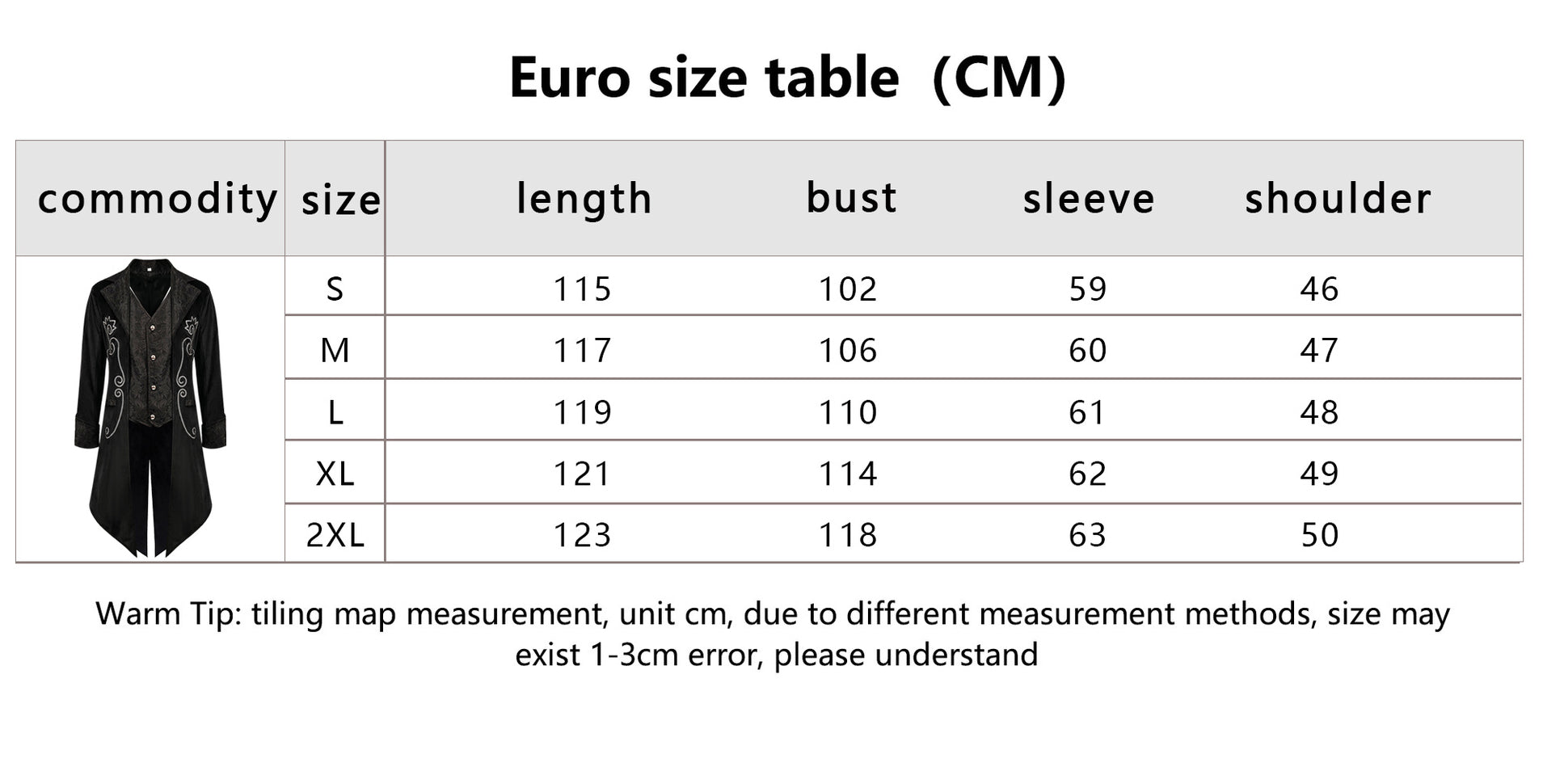 Please allow 1–3 cm variation due to manual measurement (1 cm ≈ 0.39 in).