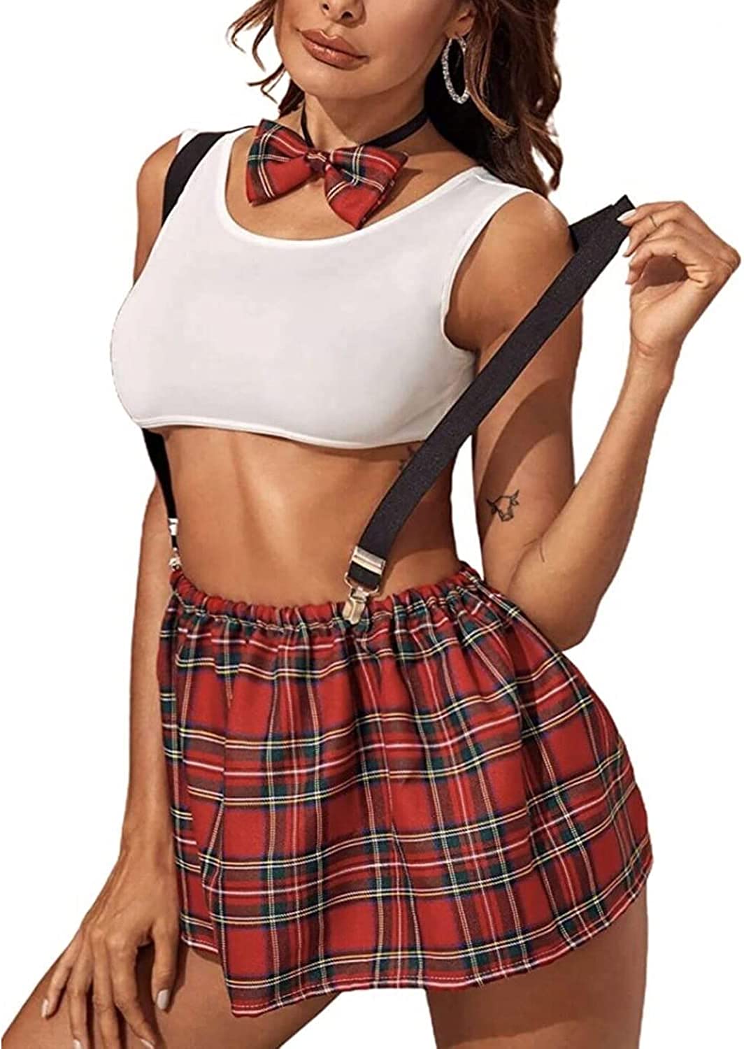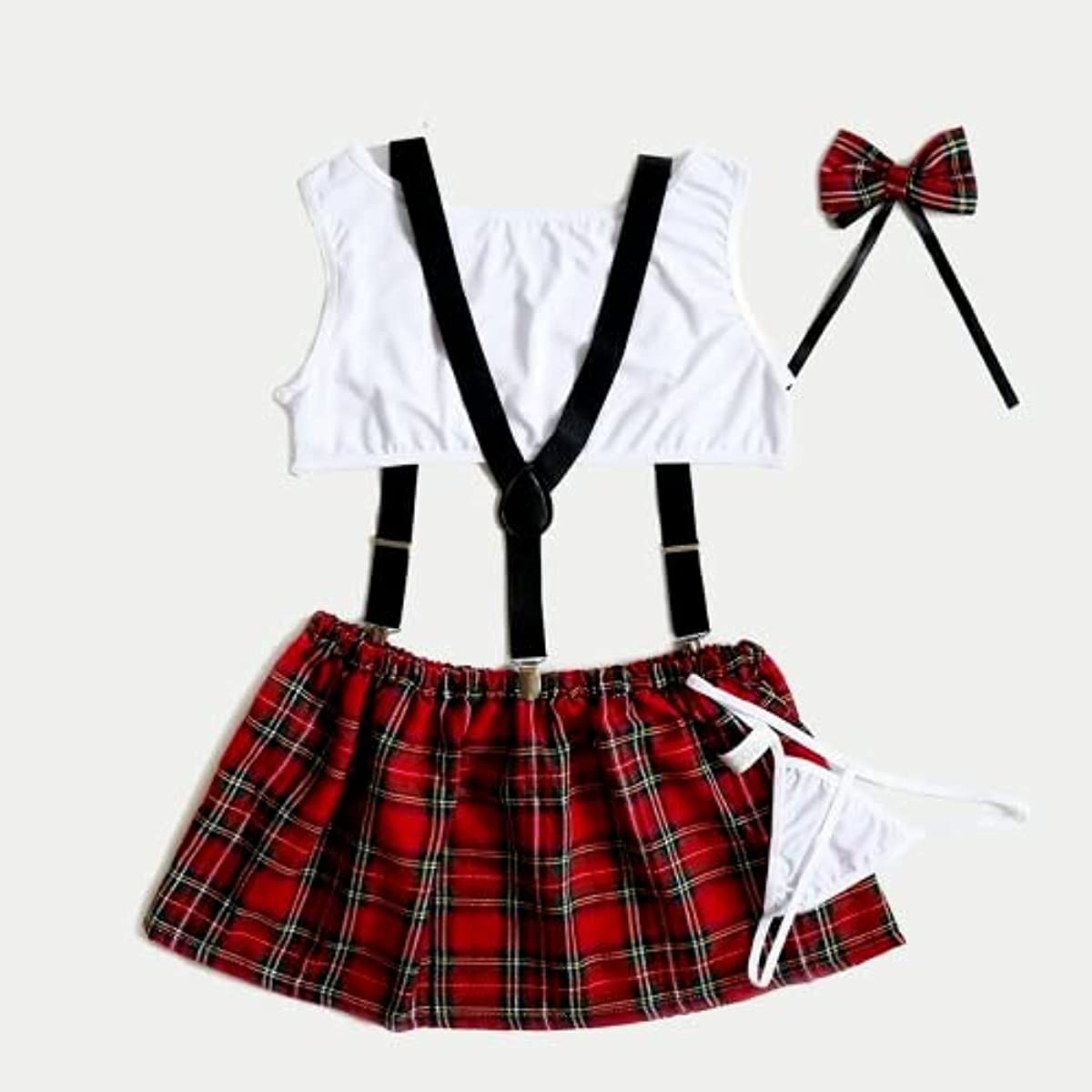 Adult uniform-inspired plaid lingerie set made from soft, stretchy fabric. Flexible fit (best for XS–L) with a sleeveless top, plaid midi skirt, suspenders and a cute bow tie—perfect for parties, clubwear, role play or intimate occasions.