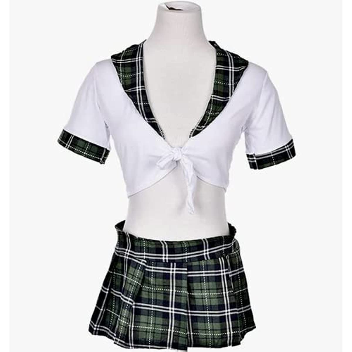 Adult uniform-inspired plaid lingerie set made from soft, stretchy fabric. Comfortable one-size fit (best for XS–M). Ideal for parties, clubwear, role play, or intimate occasions.