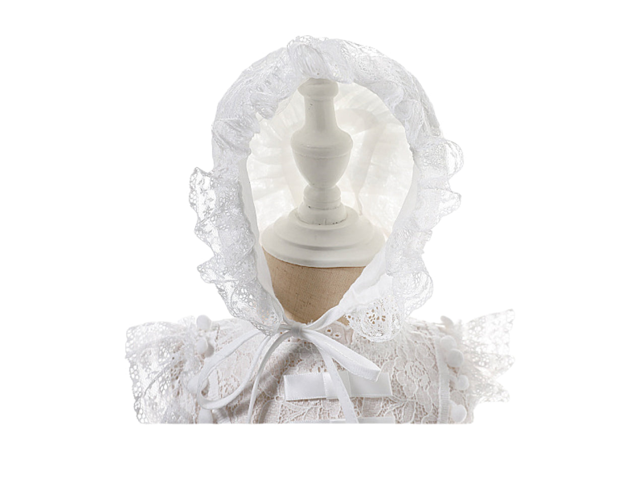 This charming white lace baby gown features a soft puffed tulle skirt and intricately crocheted lace bodice. The sleeveless design includes delicate pom-pom trim and satin bow details. Paired with a matching bonnet, it offers a truly angelic look for baby’s first special moments.